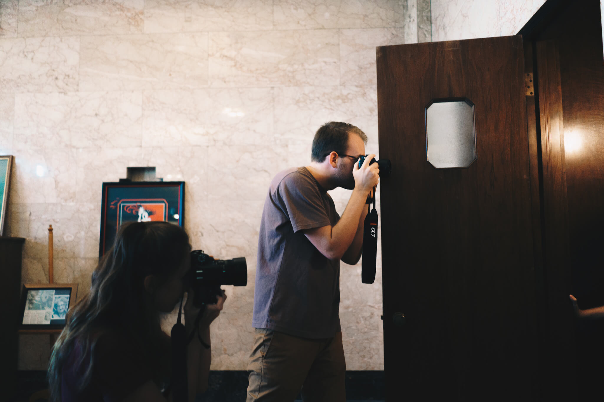 Once on the second floor, we walked past ornate water fountains to what was originally a theater, both for performances and motion pictures at different stages of life. A now walled-in stage, back room mechanicals, rectangular openings for projectors, and striking ceiling all point back to this original purpose: