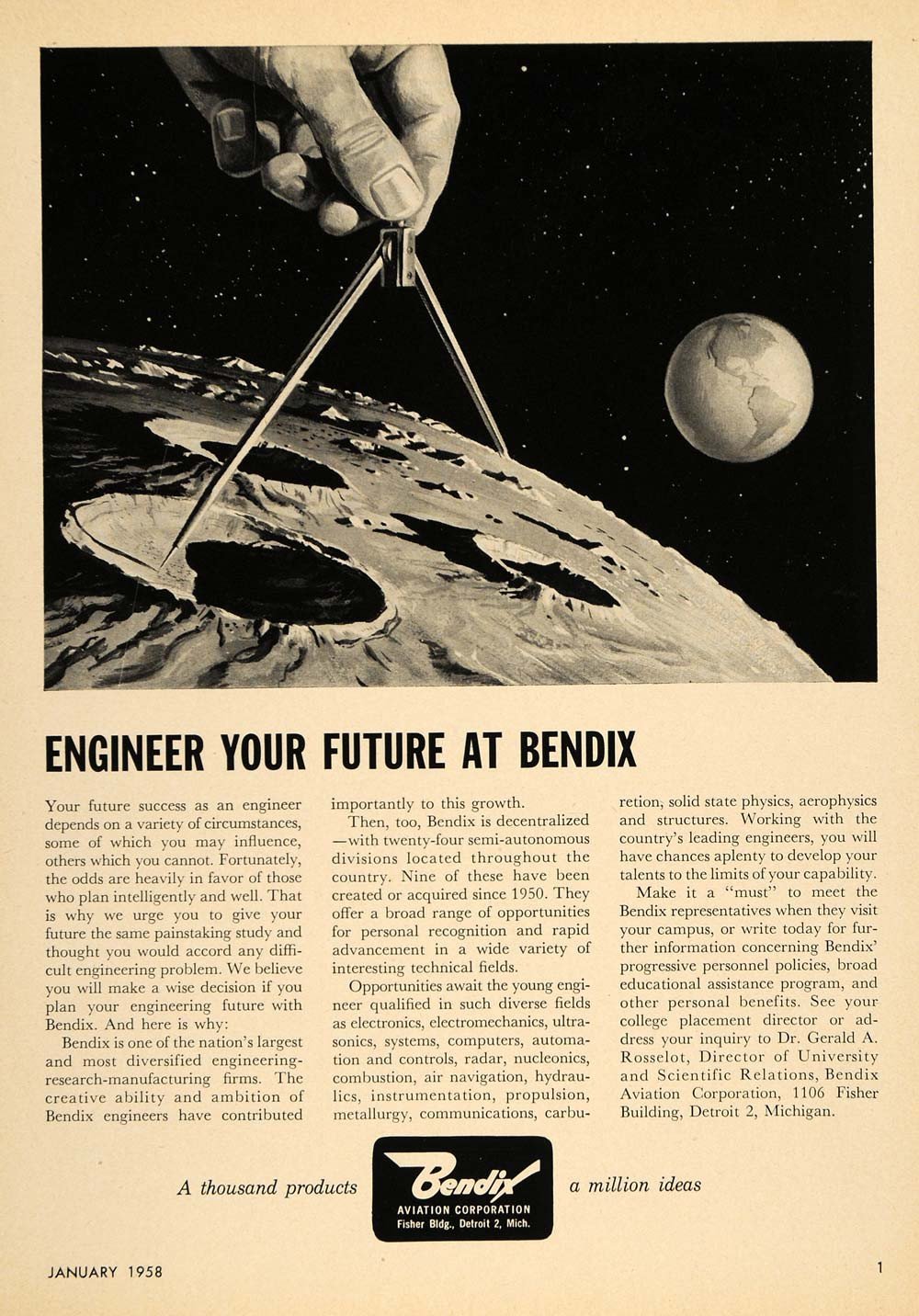 "Your future success as an engineer depends on a variety of circumstances, some of which you may influence, others which you cannot. Fortunately, the odds are heavily in favor of those who plan intelligently and well ... We believe you will make a wise decision if you plan your engineering future with Bendix. And here is why: Bendix is one of the nation's largest and most diversified engineering-research-manufacturing firms. The creative ability and ambition of Bendix engineers have contributed importantly to this growth..."