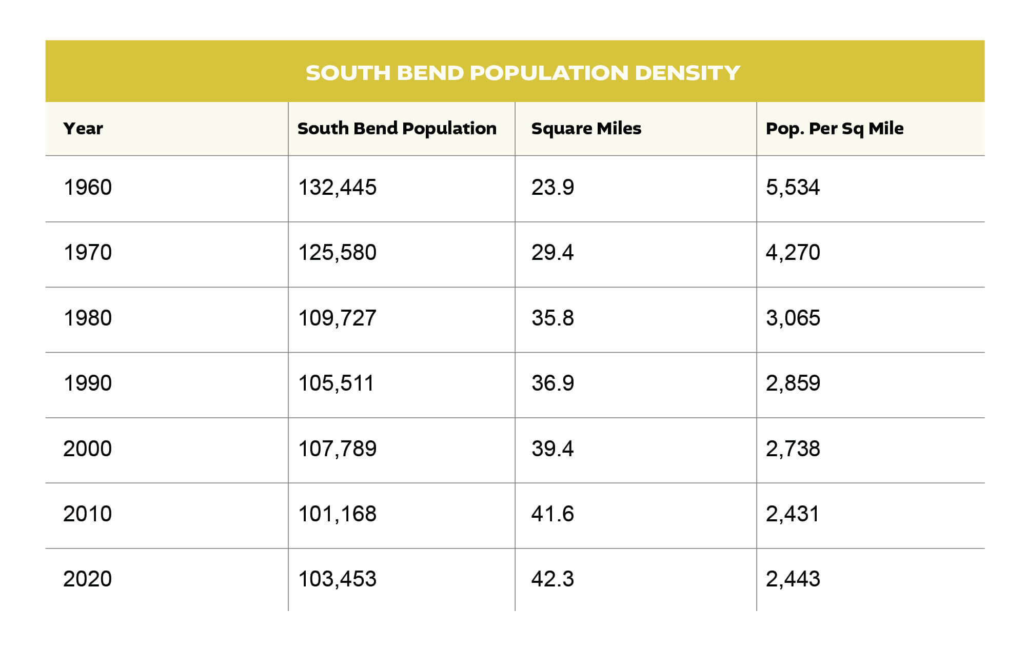 This growth increased the density of South Bend. Since the City annexed almost no residential land over the past decade, all of this residential population growth occurred on land already in South Bend in 2010.