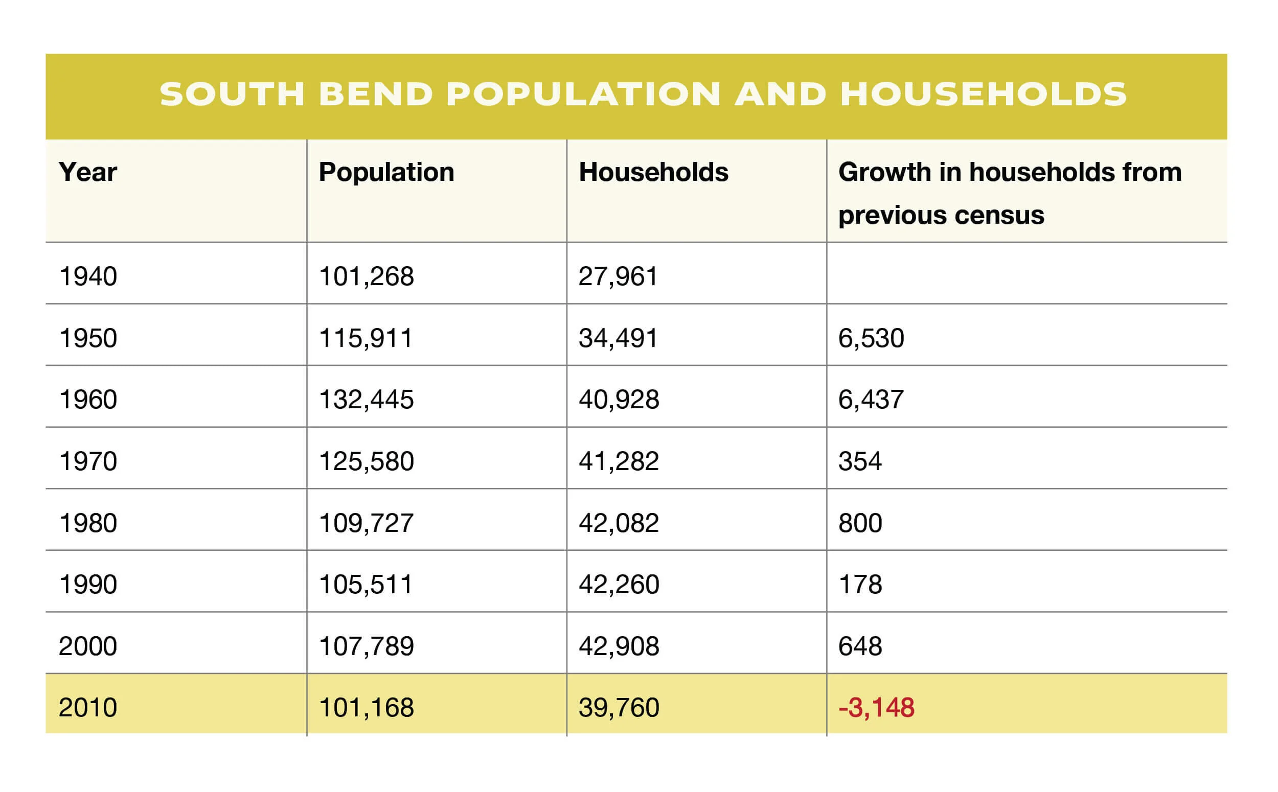 South Bend is Tiny Town. From 1960 through 2010, it lost approximately 32,000 people and more than 1,000 households. However, the decline was not uniform from decade to decade. Just like Tiny Town, there are two distinct phases of decline. From 1960 to 2000, the city lost around 25,000 people, but the number of households increased over that period. From 2000 to 2010, the city lost about 6,000 people and, more ominously, over 3,000 households. This was the first time in South Bend’s history the number of households declined. Not during the Great Depression, nor after the collapse of Studebaker and other local industrial giants, had the city failed to add households like it did in the 2000s.