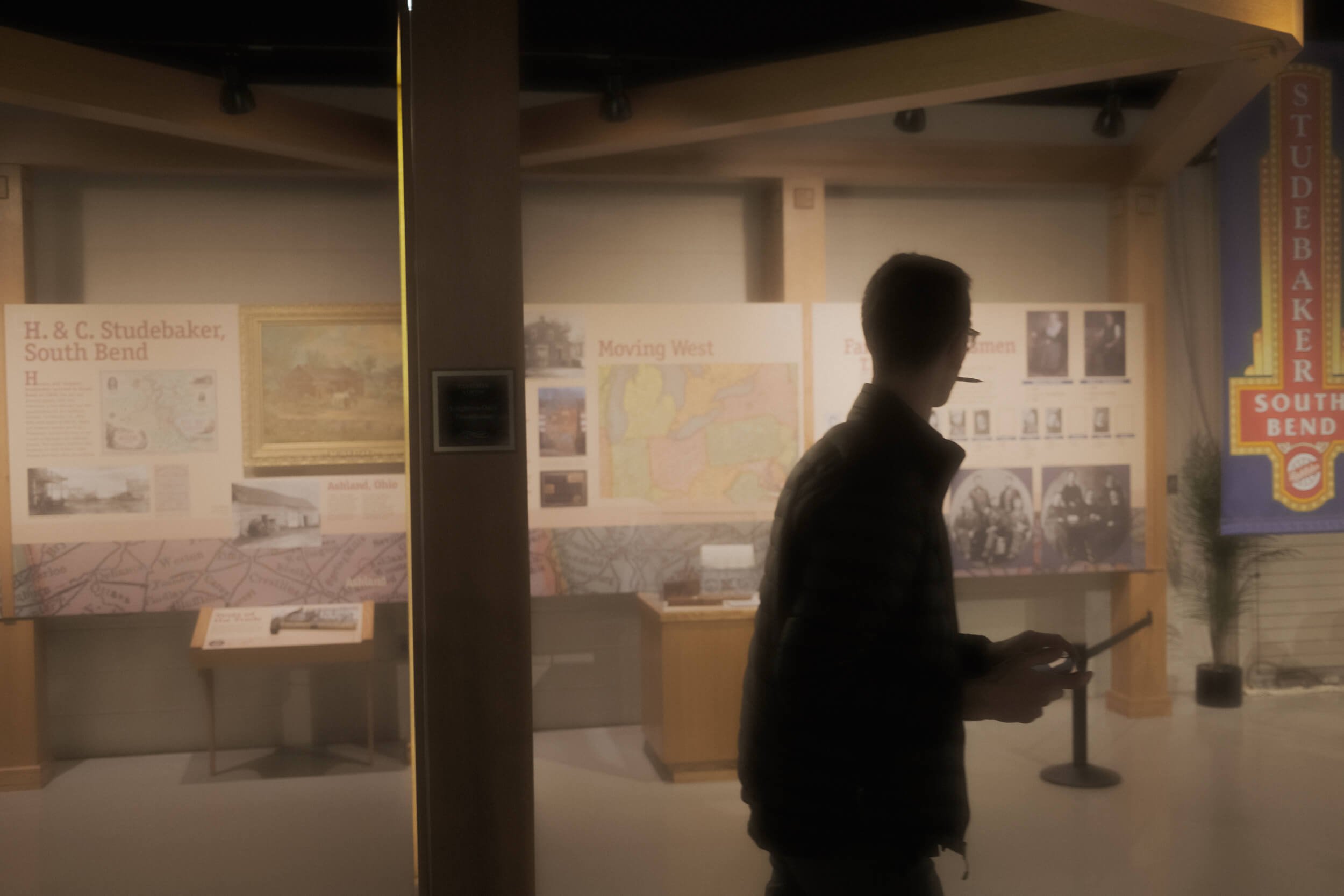 My coworkers had so often mentioned “Studebaker” since my arrival in town that I couldn’t help to be aware that it had once existed, and that its vanishing had left scars on the skin of the city and on the psyches of its inhabitants. As to when or why this had happened, I had no idea. Nor had I been to the museum towards which I walked that cold night, passing Washington’s grand, fading homes, lit trees blinking in the windows. When I turned on Chapin to walk beneath the banners flapping on lampposts, I caught sight of the museum’s lights from the street and hurried towards it.